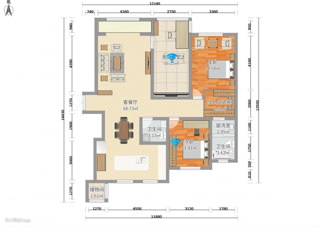 楼主家建筑面积为155平,在上述布局中采用2节点布置。