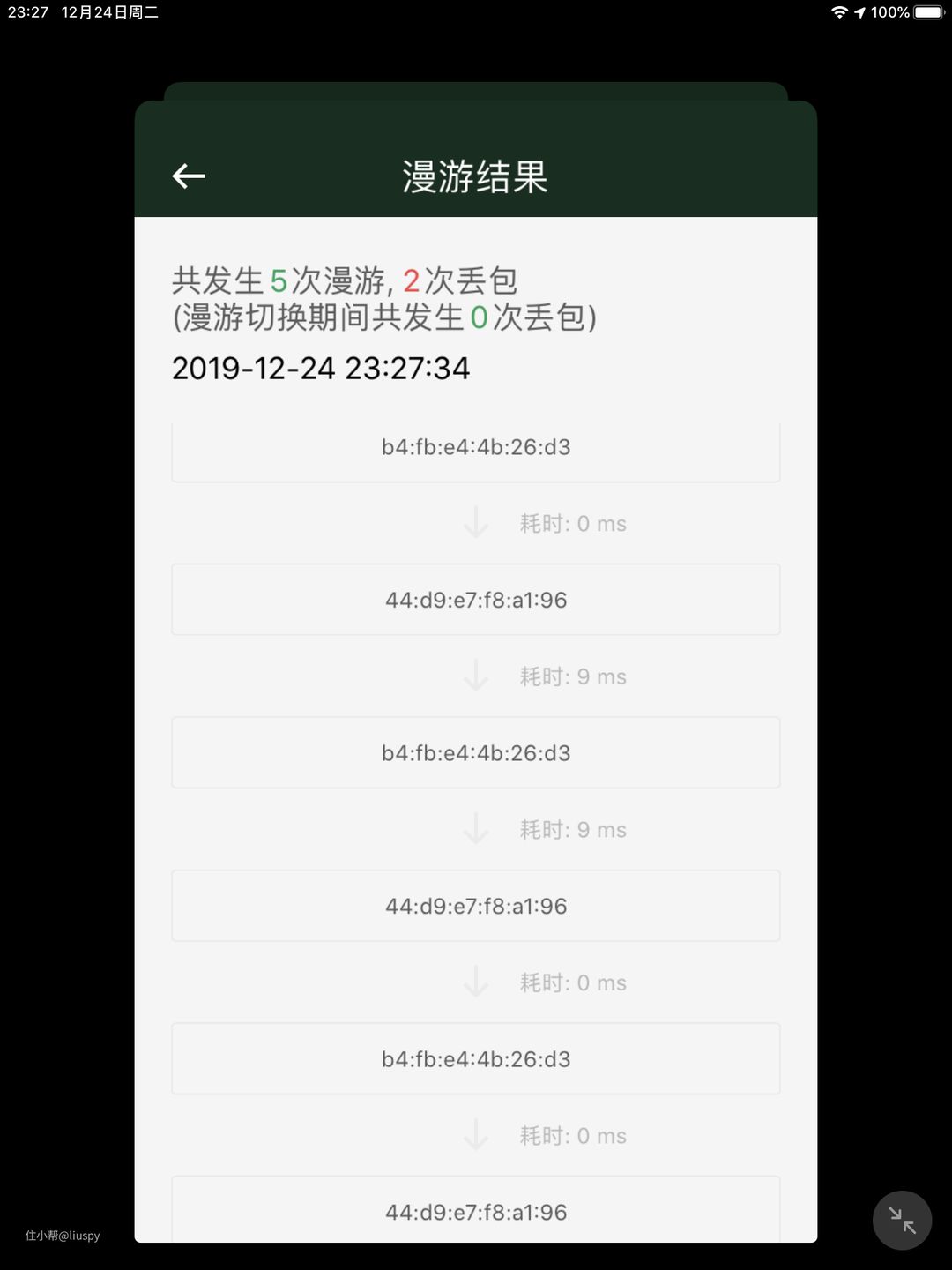 而对于支持802.11Krv的无缝漫游协议的苹果设备来说,漫游速度更加的迅速和准确。楼主用ipad mini5 进行了漫游测试,可以看到漫游速度非常的快,只有10ms左右,真正做到了无缝。实际的手游体验中几乎感觉不到网络的切换。