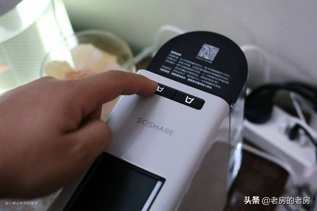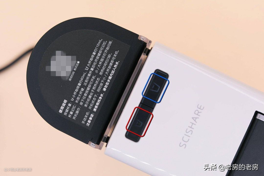 整个机身只有两个按键,也就是老房标注的红框和篮框处,按下任意键即可开机。红框处为小杯键,篮框为大杯键,大/小杯同时闪烁表示机器处于预热状态,预热时间约为25秒。然后根据需求按大/小杯即可制作咖啡。开机状态下,同时按住大小杯键也可以手动关机。