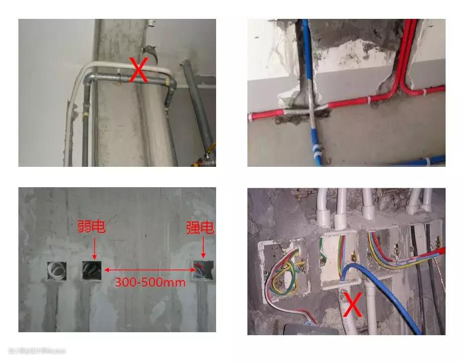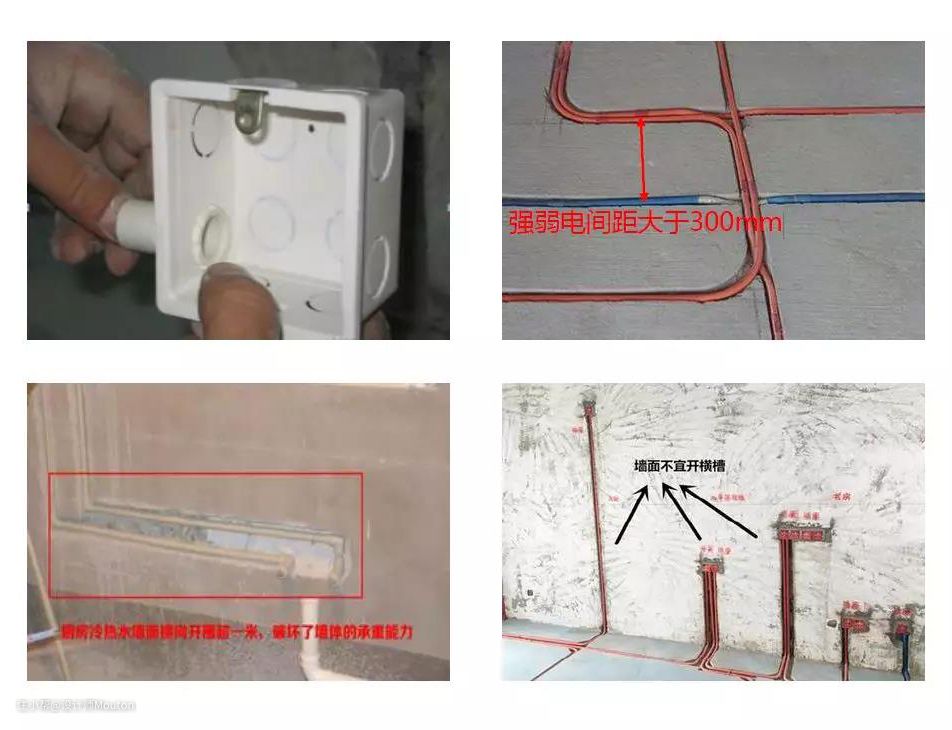 ② 线管和暗线盒之间用盒接连接,强弱电管平行距离不能低于300-500mm,轻体墙横向开槽不超过50厘米,承重墙上不允许横向开槽,内保温墙横向开槽不超过100厘米,强弱电间距大于300mm。