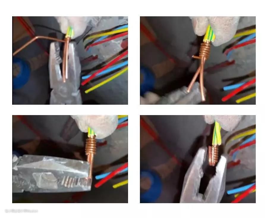 将多根导线的线芯并拢,用其中一根导线的线芯紧密缠绕其他导线的线芯,一般缠绕6-8圈,剪去多余导线的线芯,用钢丝钳钳紧即可(爪型接法)。