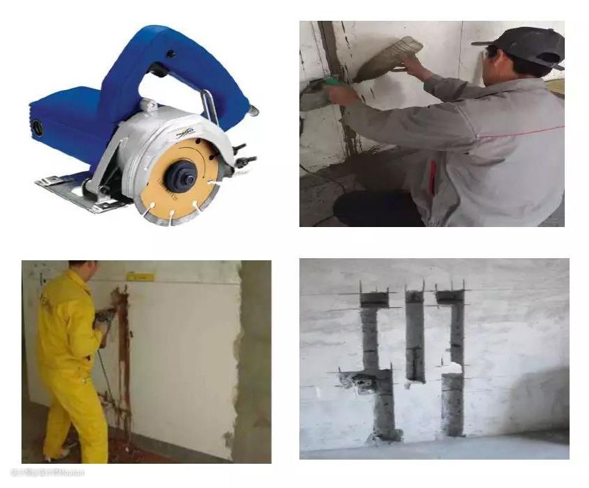 首先根据弹好的线用切割机边洒水边切割,切割完用电镐等机械打掉碎块并清理干净。