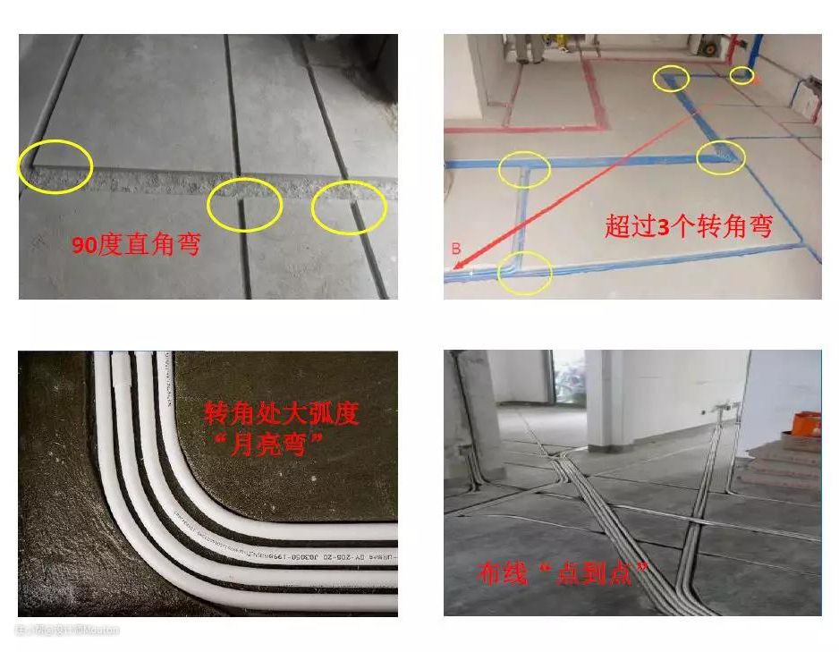 ④ 水电开槽、布管时,传统工艺为“横平竖直”,易超过3个转角弯,推荐使用“点到点”工艺,电管在转角处弯曲弧度不宜过小,推荐弯成大弧度“月亮弯”,便于穿线及后期维修。