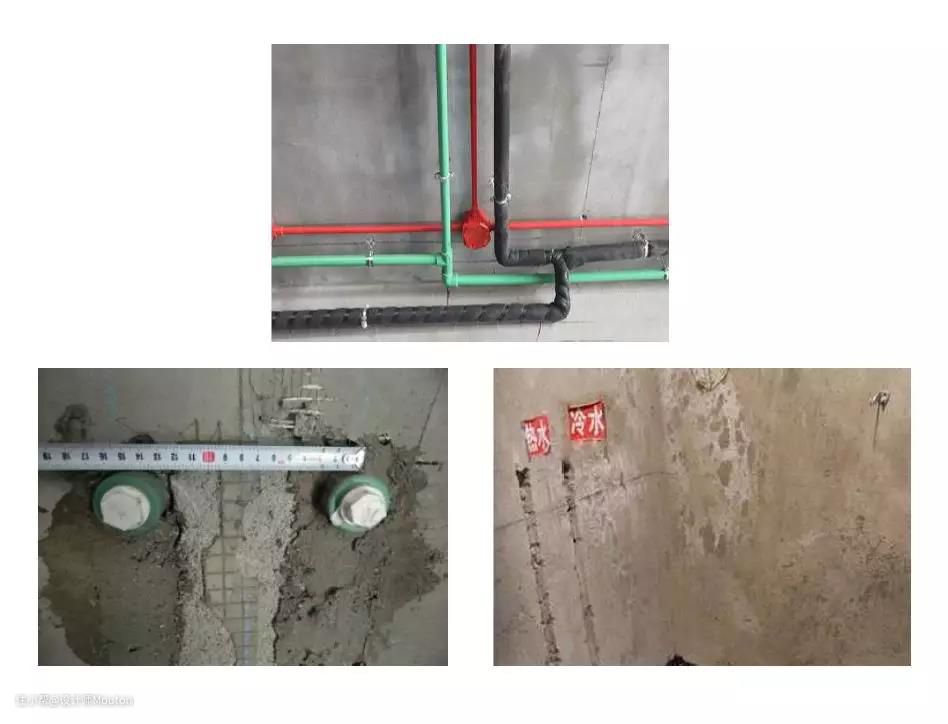 水管管路先弹线,再开槽,水管管路开槽应横平竖直。平顶走水管时,应每隔500mm长度范围设一管卡,水电管同时排布时,应电上水下。
