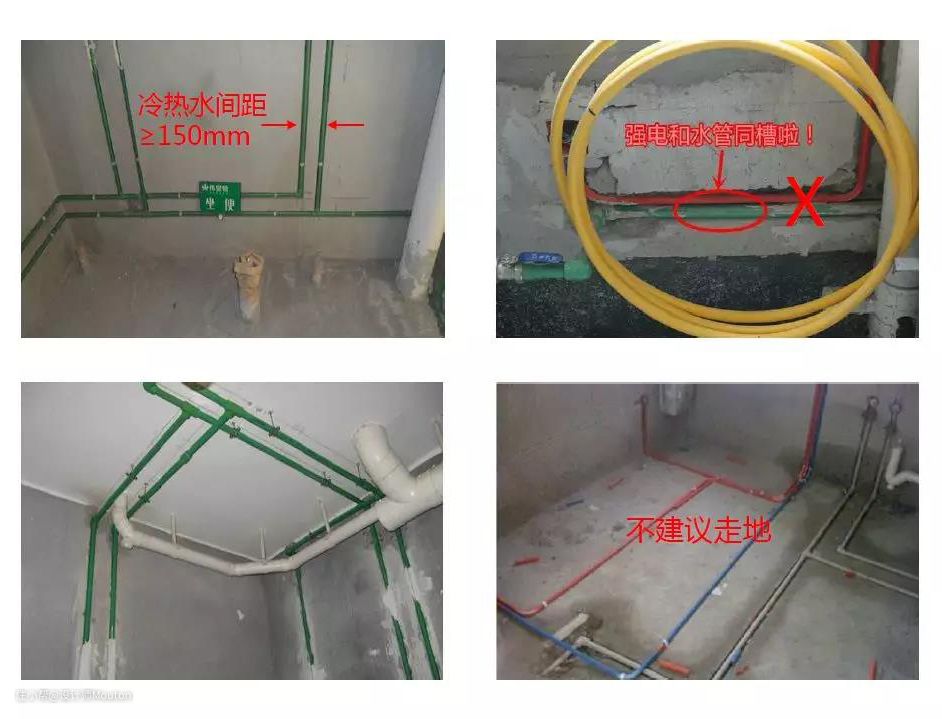③ 冷热水管间距不低于150mm,水电不同槽,厨、卫水电路走天不走地。