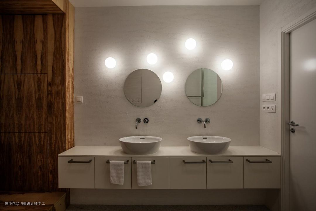 卫生间里双洗漱盆的设计很是方便,台面宽敞,收纳空间也很充足,墙壁上的灯也方便了朋友平时画了美美的妆。