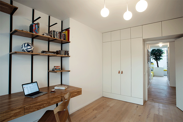 这儿既是书房,同时也是家里的客房,进门的位置打了满墙的柜子,就连门的上方空间也没有浪费,而就在这些柜子里藏了一张墨菲床,需要时放下来,也不会碍事。