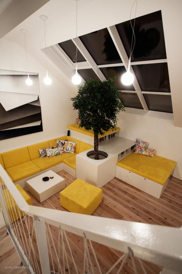 她家的客厅我还蛮喜欢的,客厅中间竟然还种了一棵树,黄色的沙发在家里显得很是亮眼,拐角的部分设计成了阶梯式,上面可以放东西,休息,下面还能放一些书籍,平时坐在沙发上,随手拿一本书就能看。