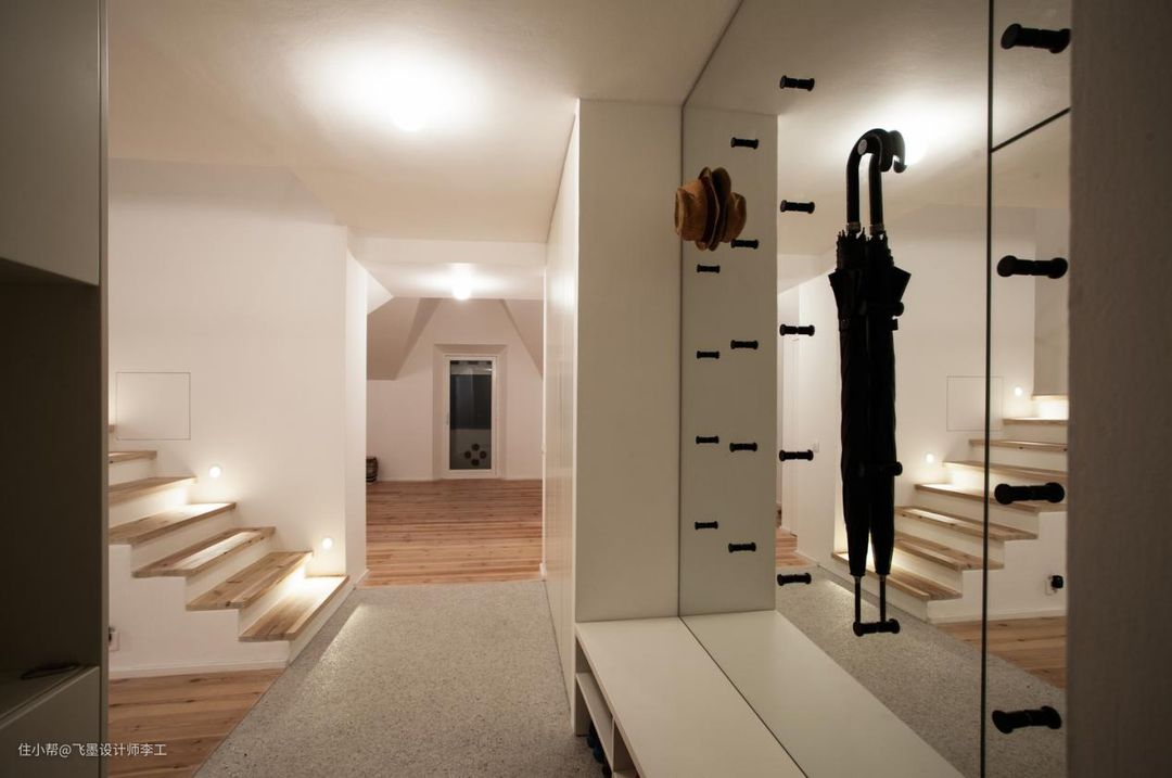 玄关处两边都是收纳空间,左边是收纳柜,右边是穿衣镜搭配换鞋凳,镜子上还设计了一排排挂钩,可以将帽子雨伞挂在上面,换鞋凳下面的空间也没有浪费,设计成了两排小鞋柜,能放不少鞋子呢!