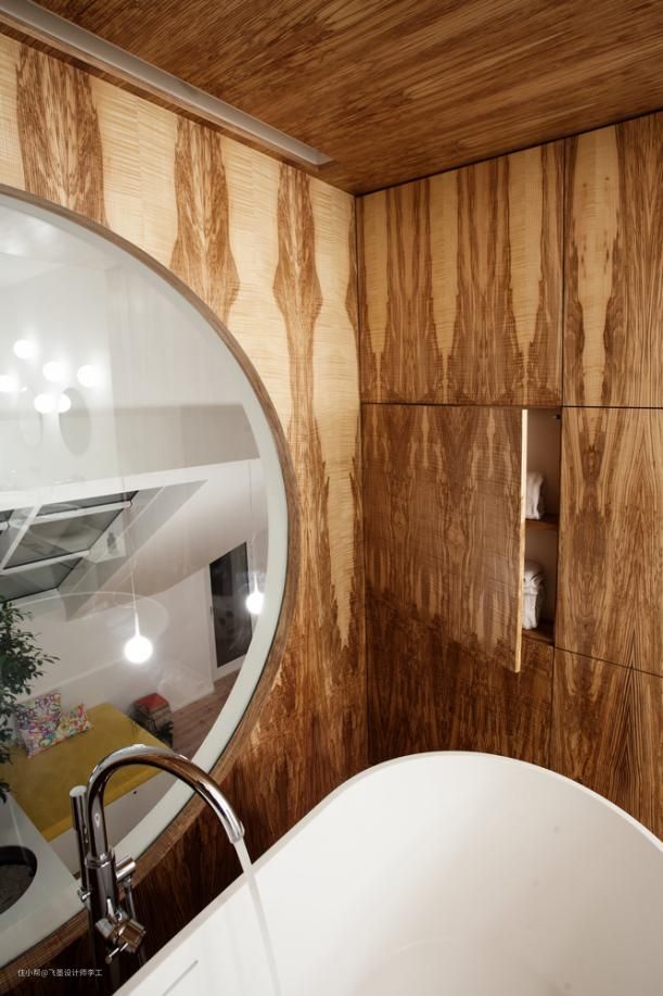 另一边地面抬高了25公分设计了一个浴缸区域,这儿还是比较有创意的,两侧的墙面其实都是隐藏的收纳空间,不仔细看还真的难发现。另外浴缸旁边还特地开了一个圆形的窗户,刚好对着客厅的天窗,朋友在这儿边泡澡还能边欣赏风景,还真的挺享受的!