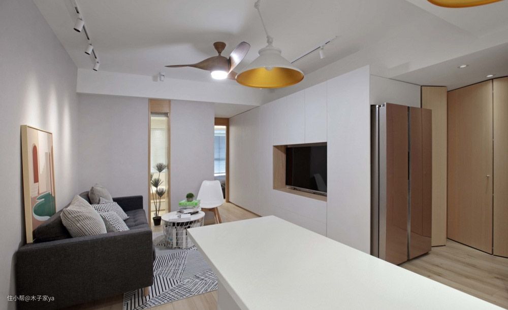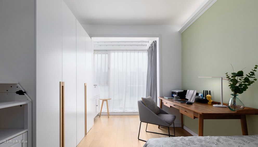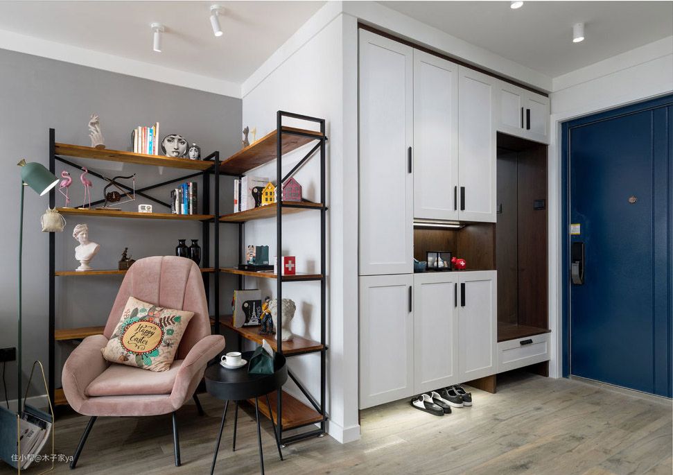 最大程度藏起来柜子,只留部分柜子露出来,能最大限度减少凌乱感,而且储物强大。