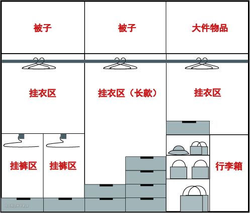 2、衣柜的分区做好很关键,主要分为被褥区、长衣区、短衣区、叠放区、裤架、抽屉、收纳格子等,根据家里衣物来合理规划分区。
