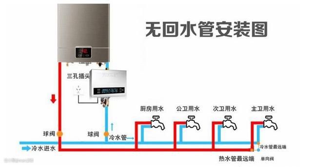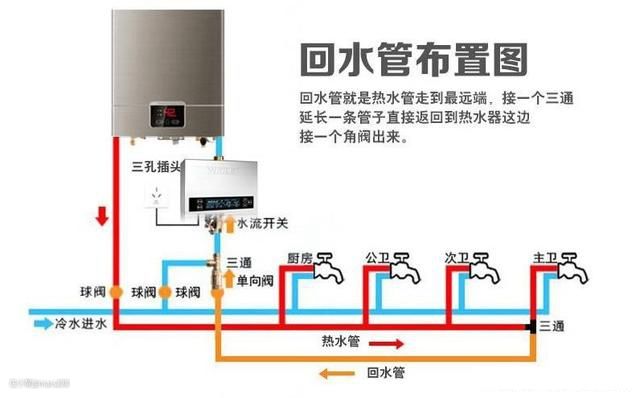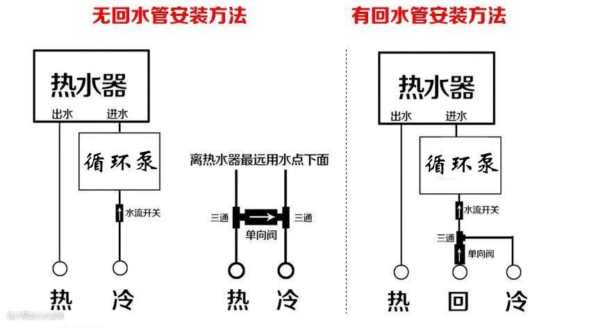 这种适合将要装修的朋友,预先规划设计好,水电改造时,在热水器的热水管(出水)和冷水管(进水)之间布设一根回水管,在热水器、热水管、回水管组成的循环管路上加装循环泵即可。当需要用热水时,提前打开循环泵,水泵将驱动循环管路中的水进行预热。