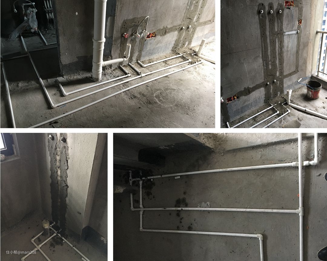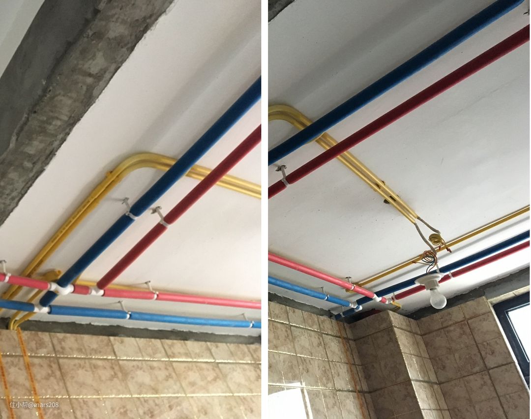 正好看到了热水循环系统的介绍,研究一通后,也就采用了燃气热水器+热水循环实现全屋热水使用(那个时候一体式“零冷水”燃气热水器刚出,价格贵的离谱),在新屋水电改造装修期间,就铺设了回水管。(注意下图,是楼主的一个错误示范,热水管和回水管应该做保温。当年楼主还不太懂。好在开发商交房时已经送了地暖,冬天使用时保温不算是问题)