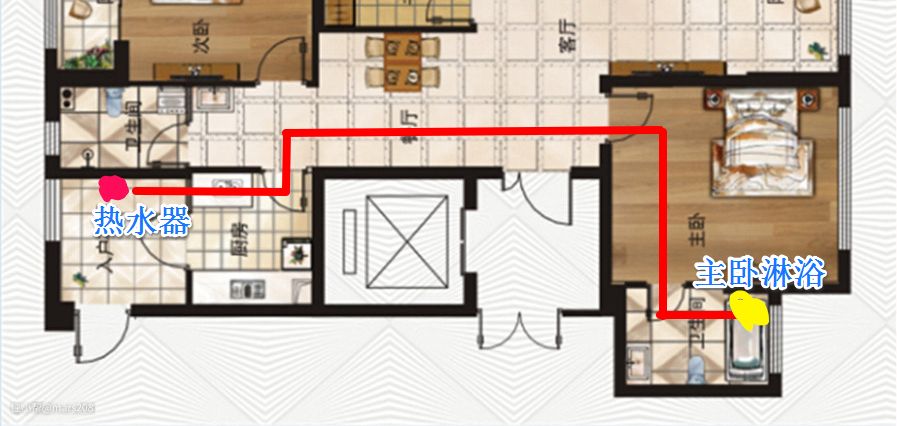 现在三室的房子多有两个卫生间,主卫、客卫。楼主新家也一样。在考虑房间热水使用的时候: