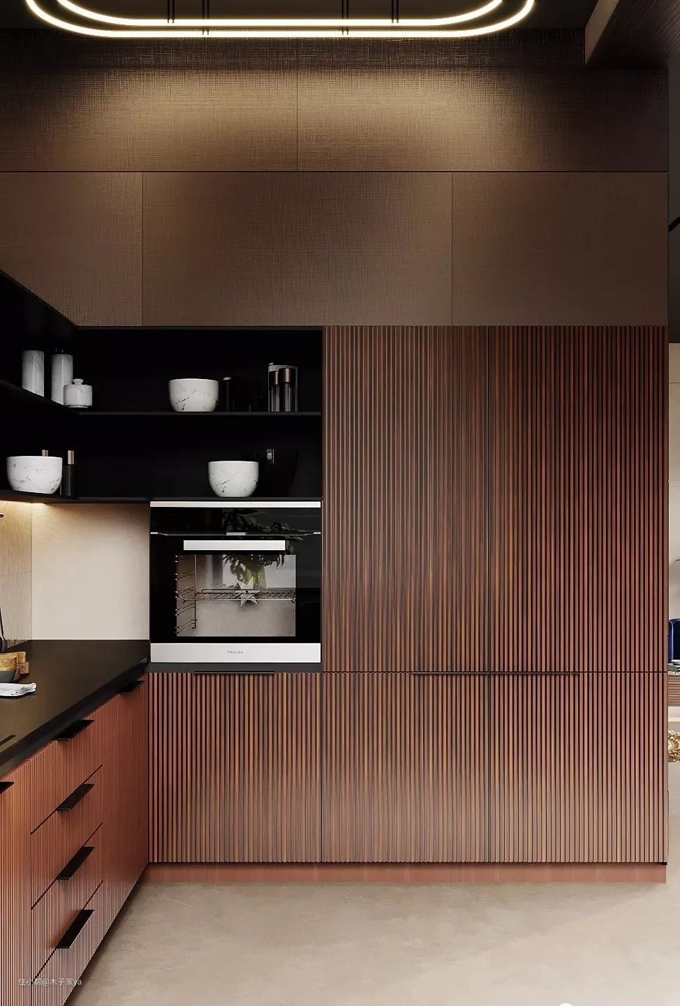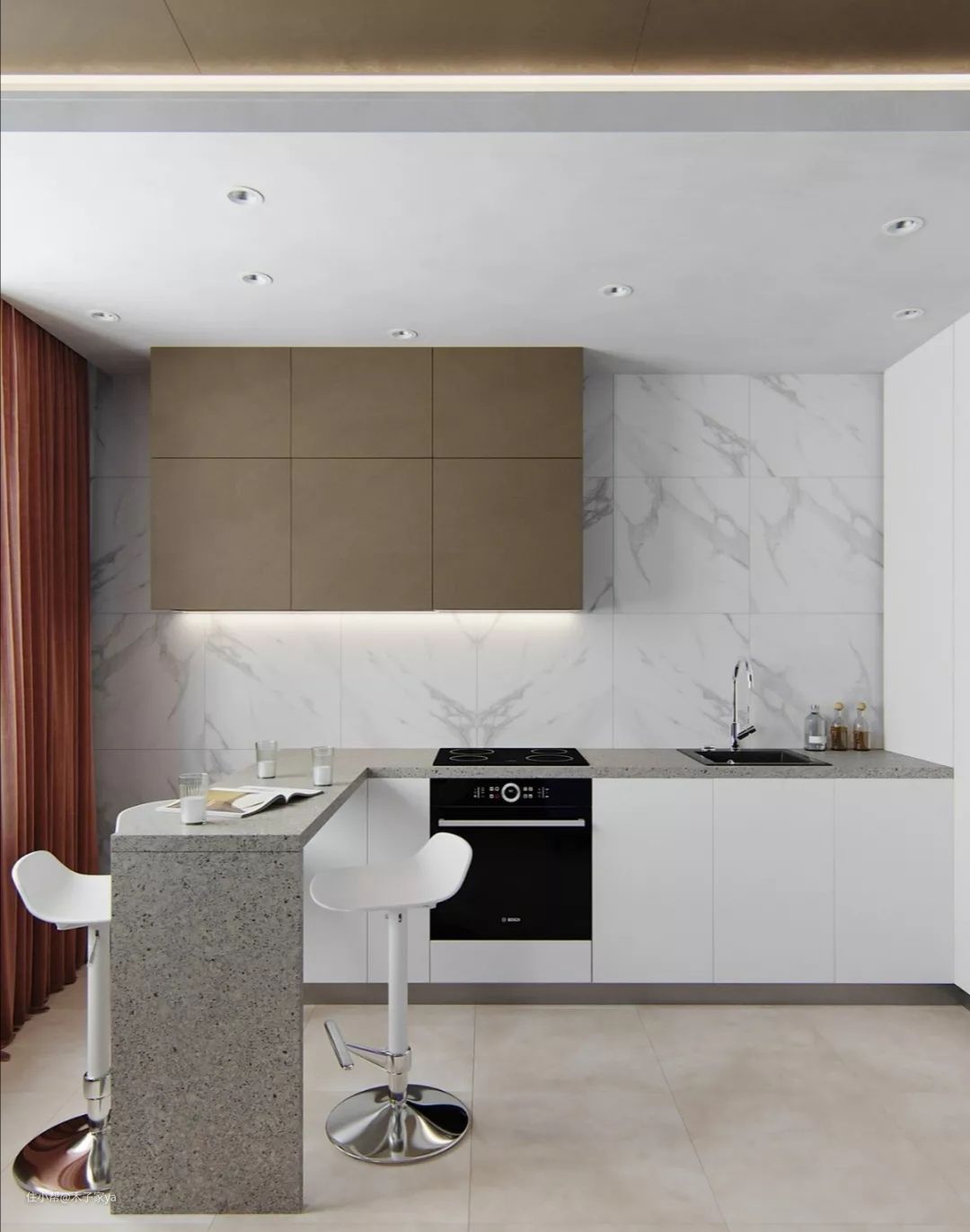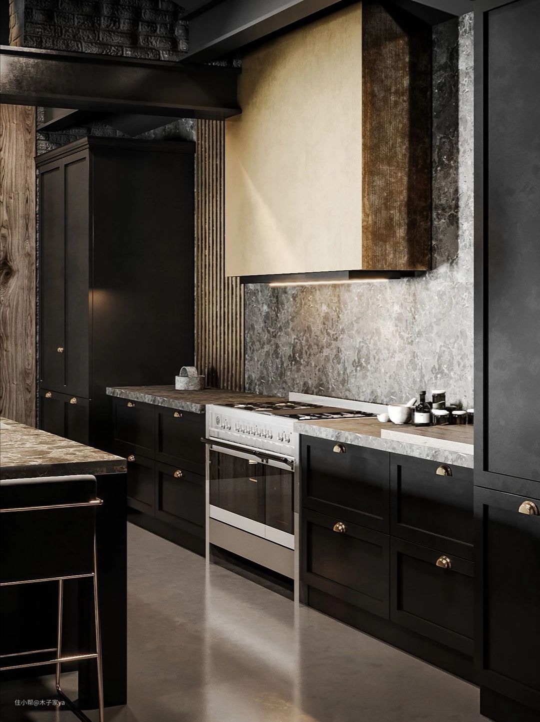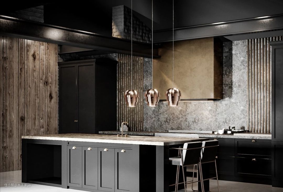 大理石橱柜台面,搭配深灰色的墙面和橱柜门板,勾勒出一幅重金属工业风的厨房风貌,可适当搭配金色灯具和饰品提亮空间。