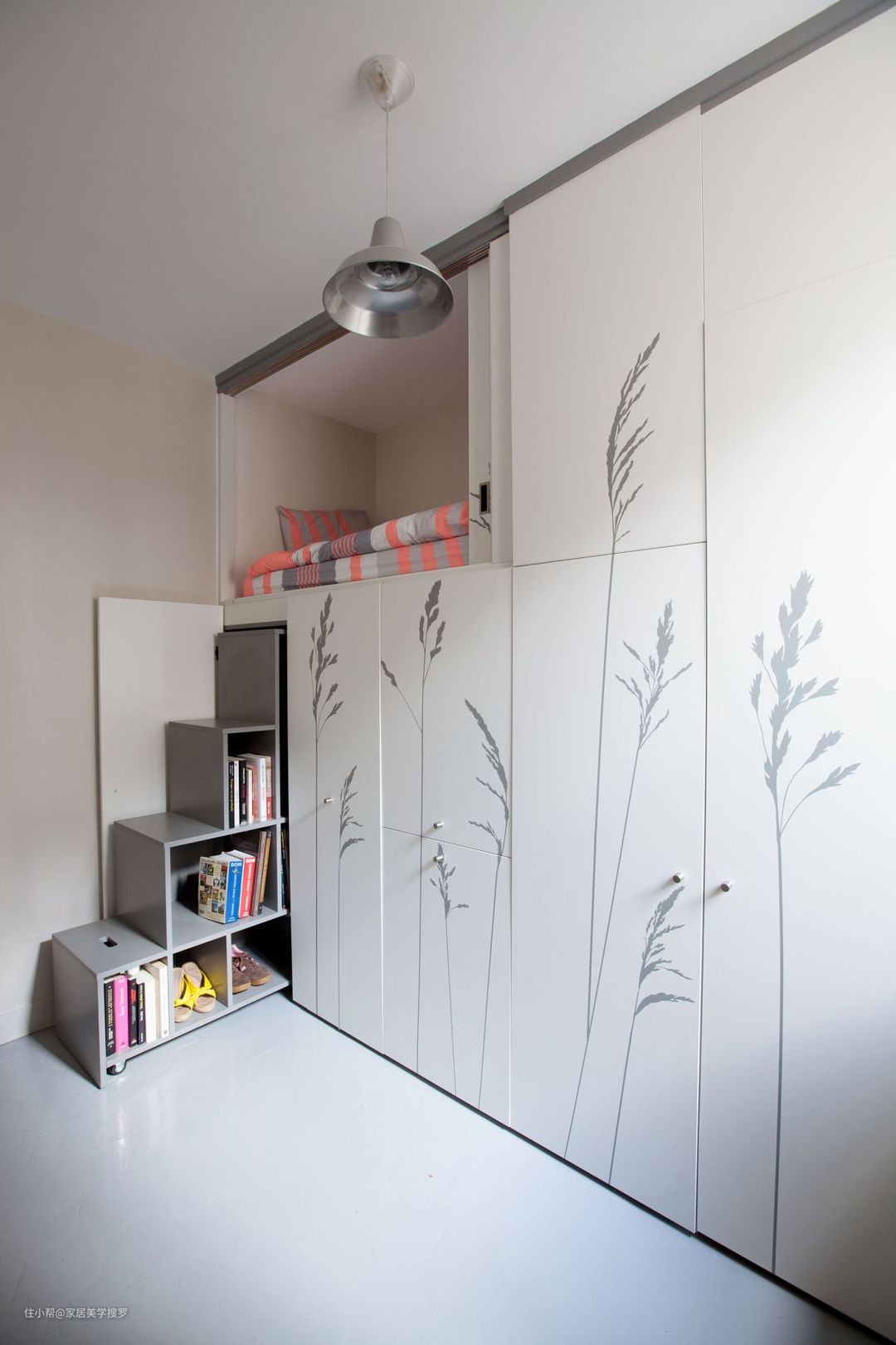 这张高架床太高了,要是没有那只梯子就很难发现它。它还有助于使床垫隐藏在那些书架模块后面。这种有趣的配置允许带有常规高度天花板的小公寓在起居室上方堆放舒适的睡眠区,从而获得更多用于其他功能的地板空间。