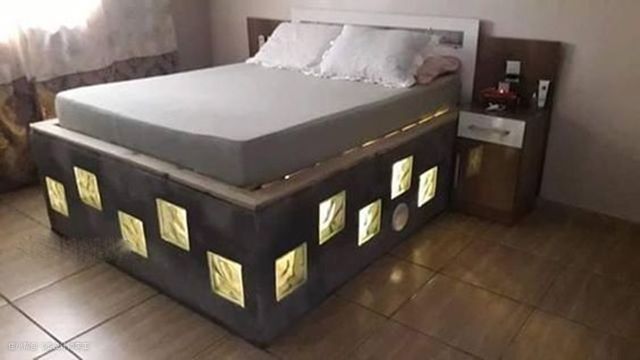 如果你家预算比较充裕的话,甚至可以舍弃红砖,直接选择用玻璃砖来砌床,美观程度会更好。但要是你家预算不多,则可以选择跟我家邻居一样,用红砖砌床,然后用玻璃砖来进行点缀,晚上打开灯也挺好看的,难怪现在这么火了!