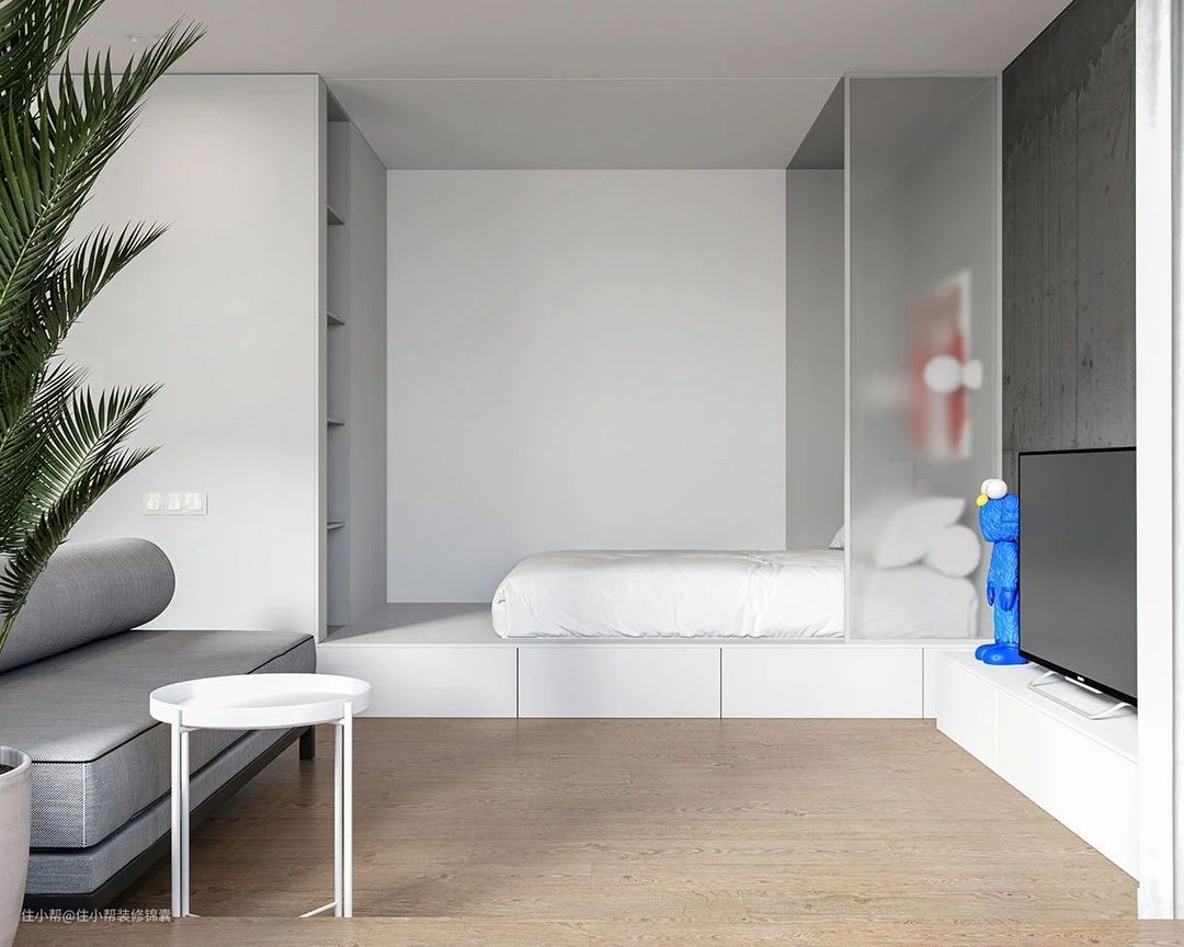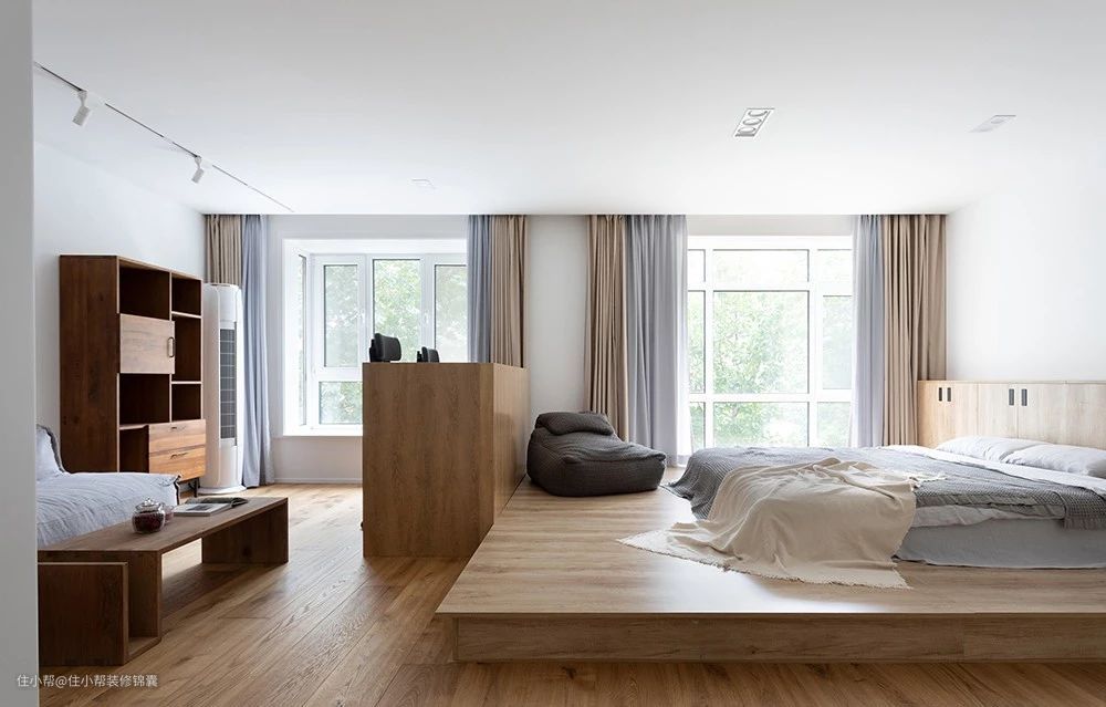 当卧室面积大于15㎡时,放完床、衣柜等家具后,室内还是会显得略空旷。设计一个地台可以充当隔断,还可以在上面喝茶、休息,区分功能空间。