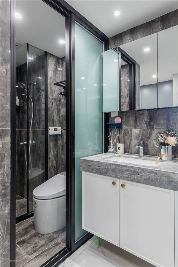 小平房卫生间,将手盆外置,镜子选择当下十分流行的收纳镜柜,三扇门取用非常方便,拉门设计,解决小户型中的房门开关占地方的烦恼。