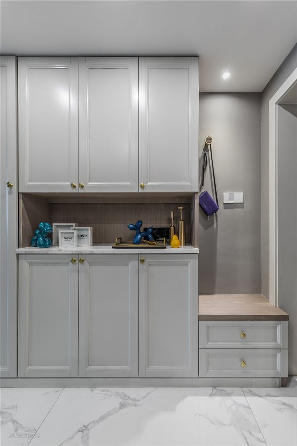 玄关处做了一个可坐储物柜,帮助业主增加储物空间的同时,还省去购买换鞋凳的烦恼。