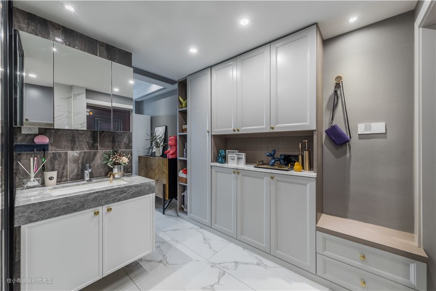考虑到两位业主在家吃饭频率较高,大厨房设计就显得尤为重要,但考虑到户型本身问题,最后做了“U字型”厨房,一面大,另一面细小,可以放置一些水壶等小家电。