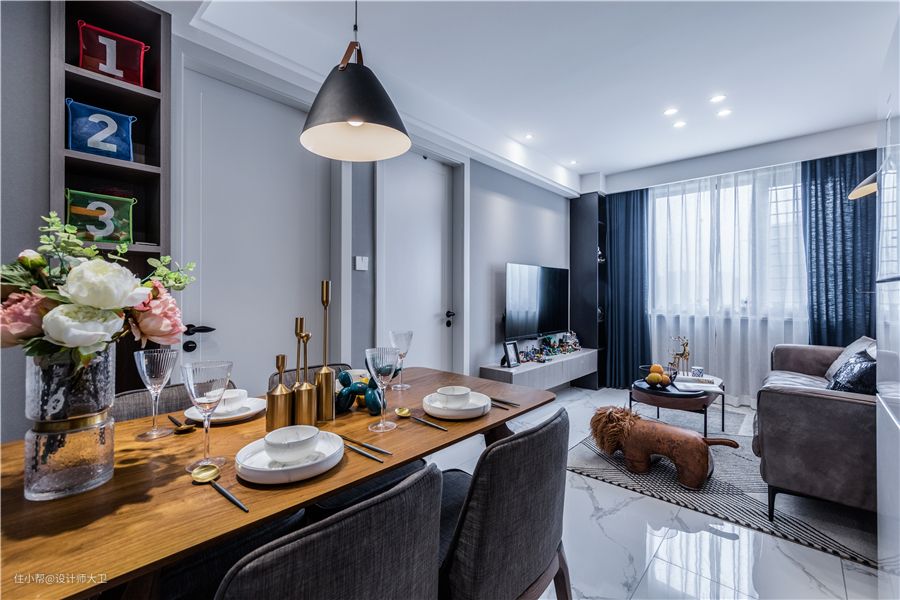整体户型面积较小,构思时将客厅和餐厅打通,既能增大视觉效果,又能保证客餐厅每一处的光线良好。