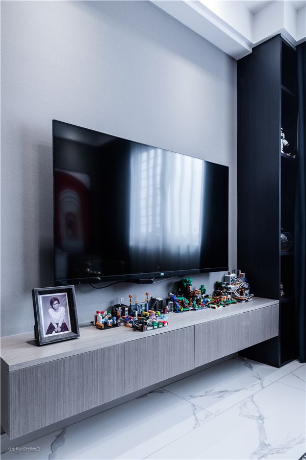 电视柜上面摆上主人热衷的乐高玩具,节省地方又起到装饰作用。
