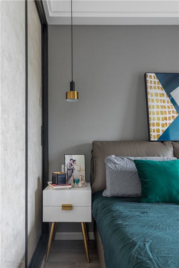 阳台用窗帘代替拉门,扩大了整体卧室面积,采光更加。自带高冷气质的金属色,配上贴近自然的墨绿色,不得不用惊艳来形容。