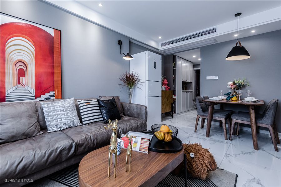 沙发选择中性色真皮沙发,简约味更浓;某宝淘来的独有特色的小吊灯,给单调的沙发背景墙,增添艺术感;冰箱放在小餐桌附近,取用方便。