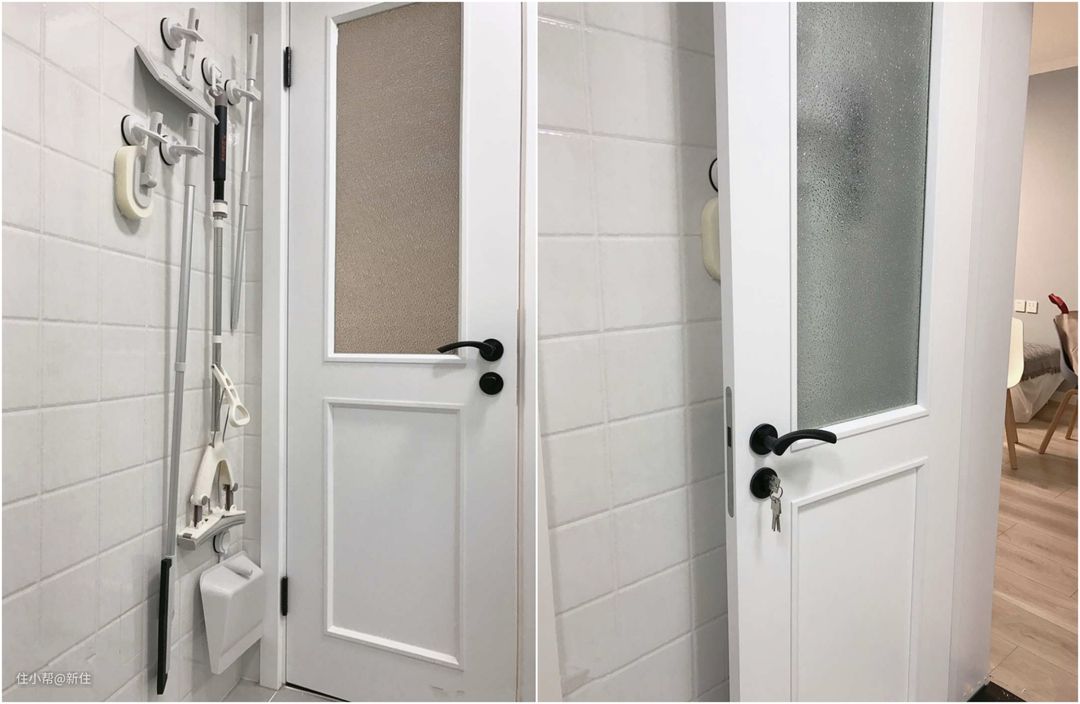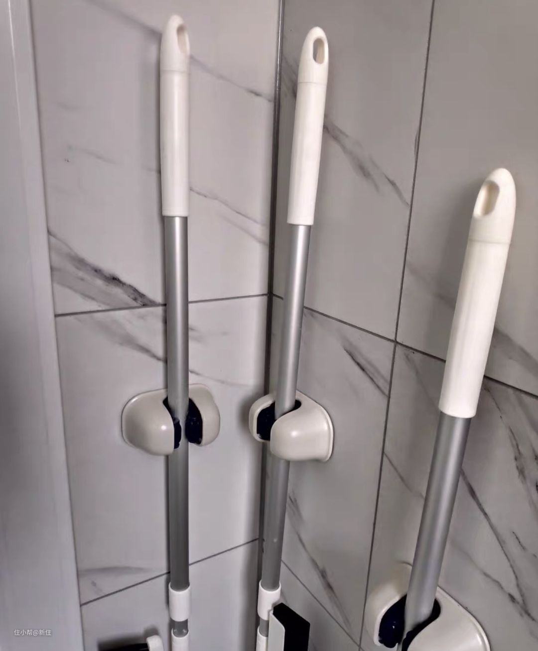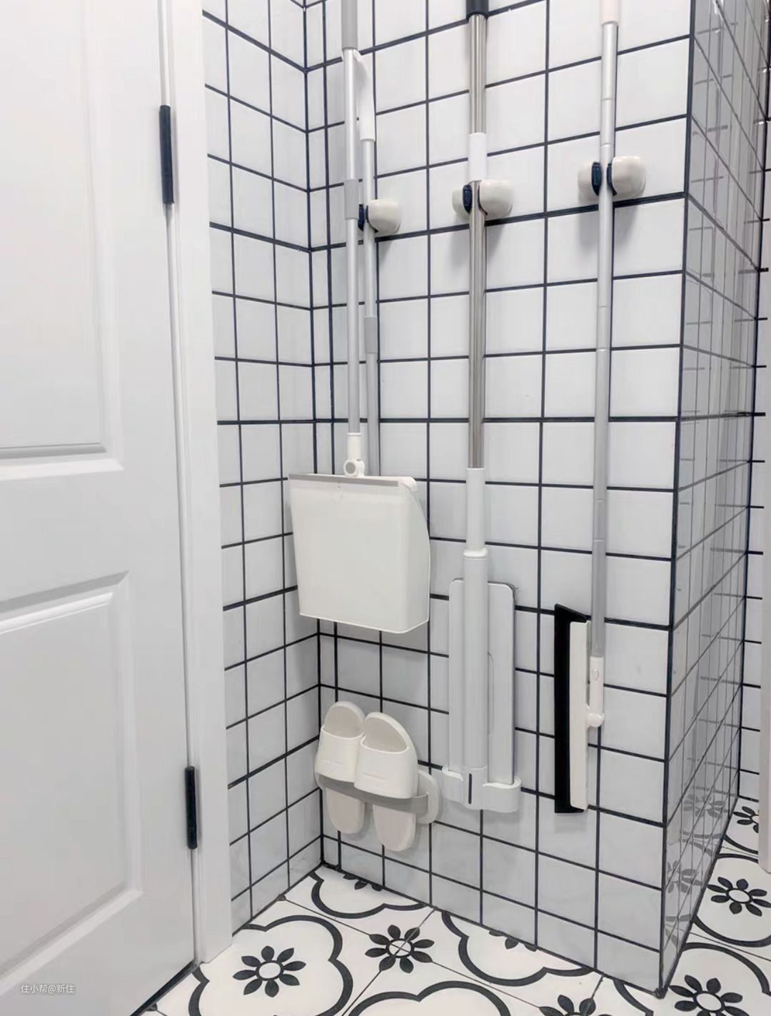 说到把清洁工具壁挂在卫生间门后,就不得不提到通用的拖把挂钩,滚轮卡扣设计,通过收纳挂杆来壁挂,从而避免了很多挂钩与挂孔不匹配的情况。