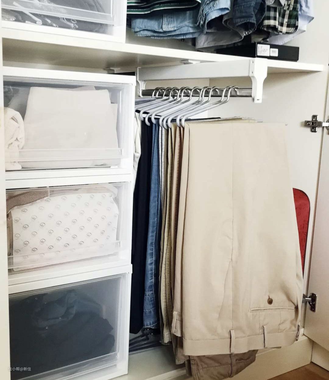 裤子整理是衣柜的难点,想要拿取方便又没有褶皱,可以使用抽拉裤架。安装也并不难,其实就是一个抽拉杆+Z型裤架组成的,个人使用经验是,把常穿的裤子放前面,不常穿放后面,拿取便捷很多,容量翻倍,也比直接挂起来的方式少占空间。