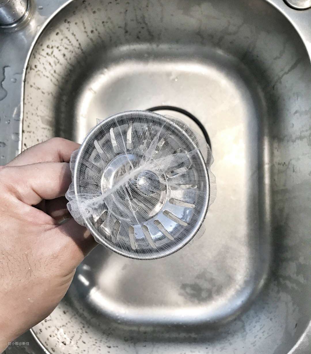 厨房水槽过滤篮清洁,绝对是厨房清洁的痛点,一个便宜又实用的小方法,就是用一次性水槽过滤网。不到10块就能买100个,很便宜,还能防止食物残渣糊住下水口而导致排水不畅。