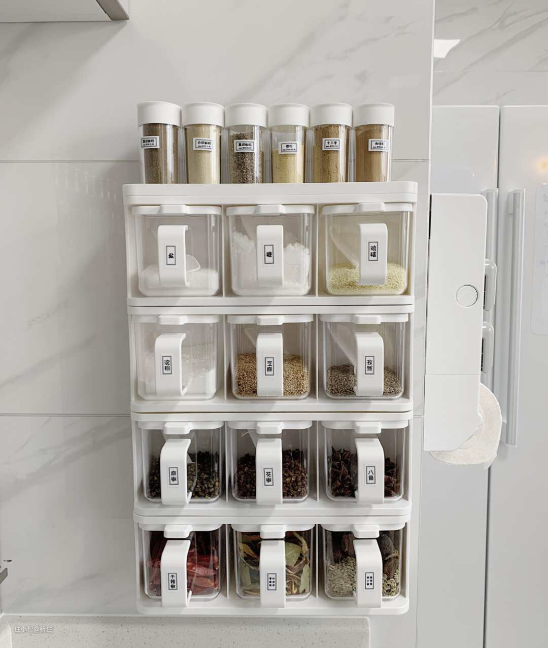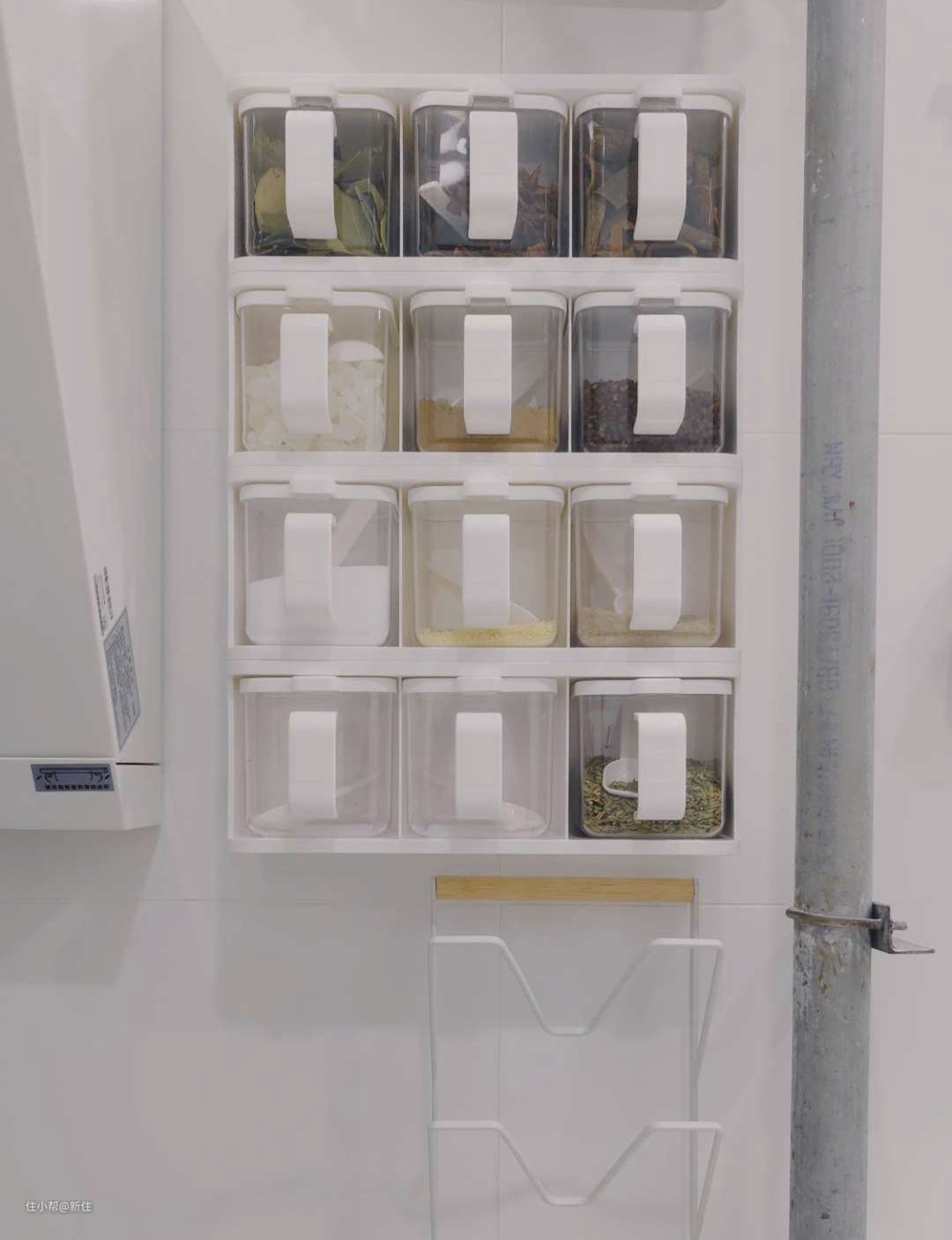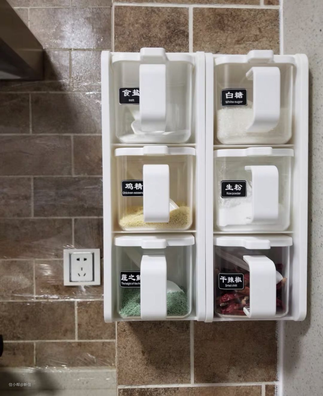 厨房刚买的调料一般都是袋装,容易回潮不说,堆在台面上看起来还很凌乱。可以换成统一的壁挂调料盒,把常用调料倒进里面,整齐又美观,拿取也便捷。