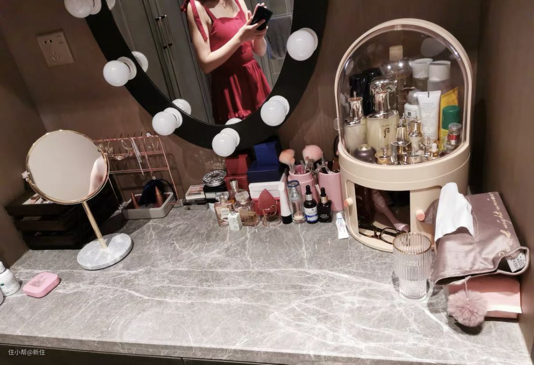 颜值超高不说,还比想象中的容量要大,我一般是把常用的水乳放上层,下面放面膜和不常用的小东西,还可以放一些小饰品。