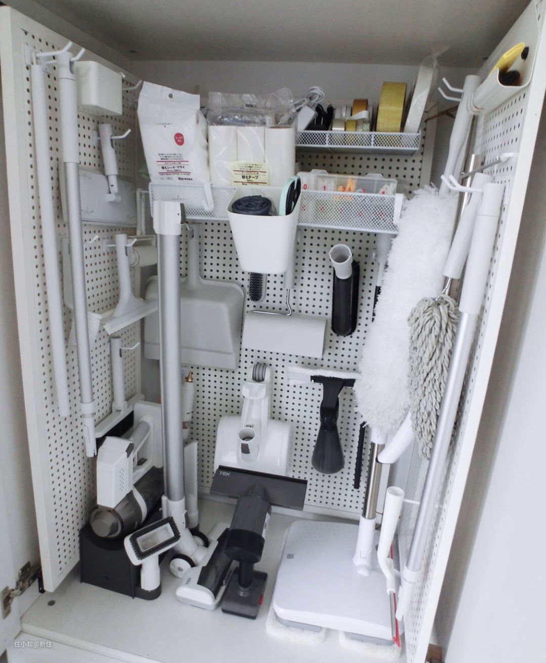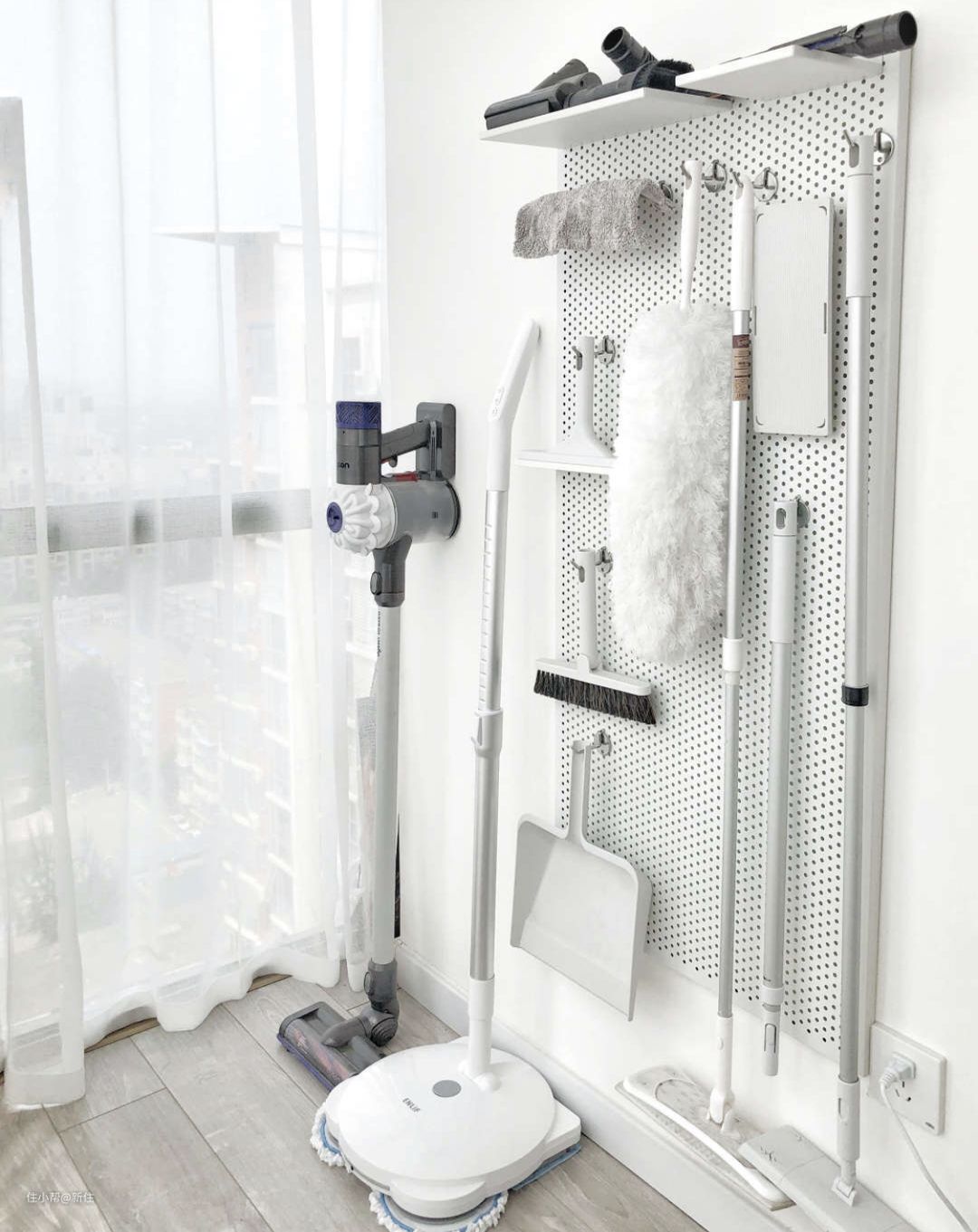 或者利用洞洞板,将之挂在阳台,单独有一个清洁工具角,改掉乱放的习惯。