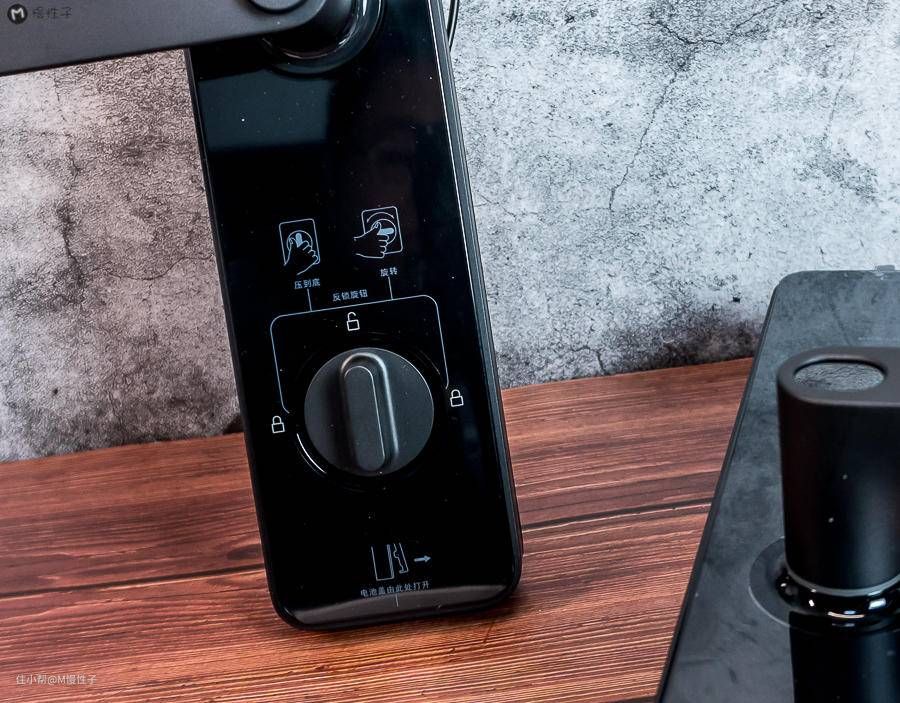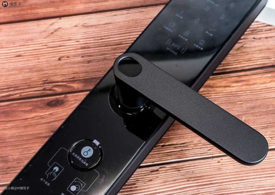 ▼先看下门外的把手部分,上部是密码区,中间是指纹,底部是隐藏式的机械钥匙孔。标记是印在保护膜上,安装后可撕掉。