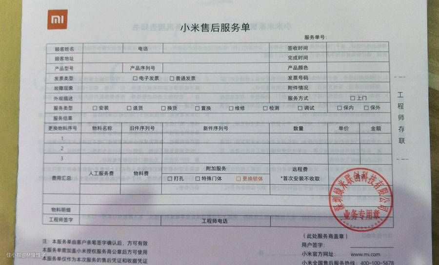 ▼同样上面的二维码也能进行安装预约,填写相关内容后,我这里是2天后上面安装的。上门后安装师傅会提供如下的服务单,确认签字后才可以安装,主要是让业主知道安装需要对门体进行改装等操作。反面有风险告知书,如不同意,是不给于安装的哦。