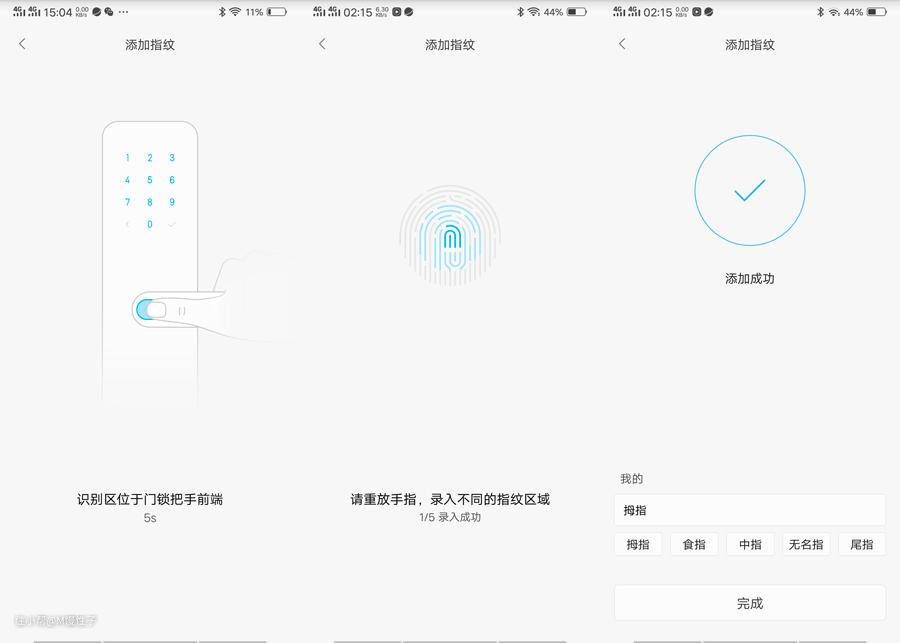 ▼设置指纹,在app选择指纹录入后,可以录入指纹,整体和手机录入指纹类似,不过次数要少的多,只需要录入5次既可以录入指纹,比手机十多次要少的多。并且指纹可以归类到个人名下做管理,最多能支持50个指纹。识别率如何呢,看看指纹解锁的部分吧。