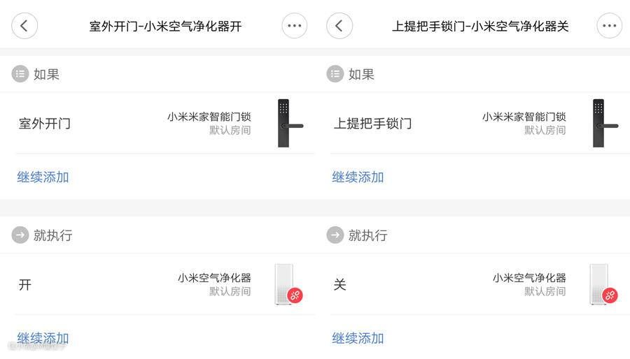 ▼与小米空气净化器联动,家中有人开启净化,无人关闭净化,延长滤网寿命。