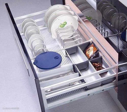 分隔拉篮多用在地柜抽屉中,最大的优点就是可以把抽屉分隔成多个收纳格,这样一来就可以根据物品的类别进行收纳,抽屉再也不会乱糟糟的找不到东西了。