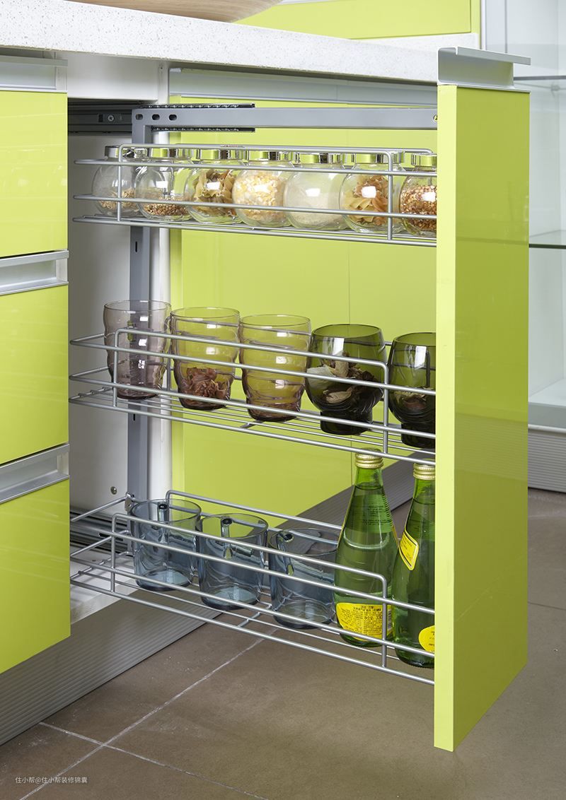 厨房物品种类多样、非常零散,在收纳时容易杂乱无章,厨房拉篮能够有效的将橱柜内部的空间分割开,使物品各得其所。由于橱柜的形状不同,从而衍生出了不同形式的拉篮。