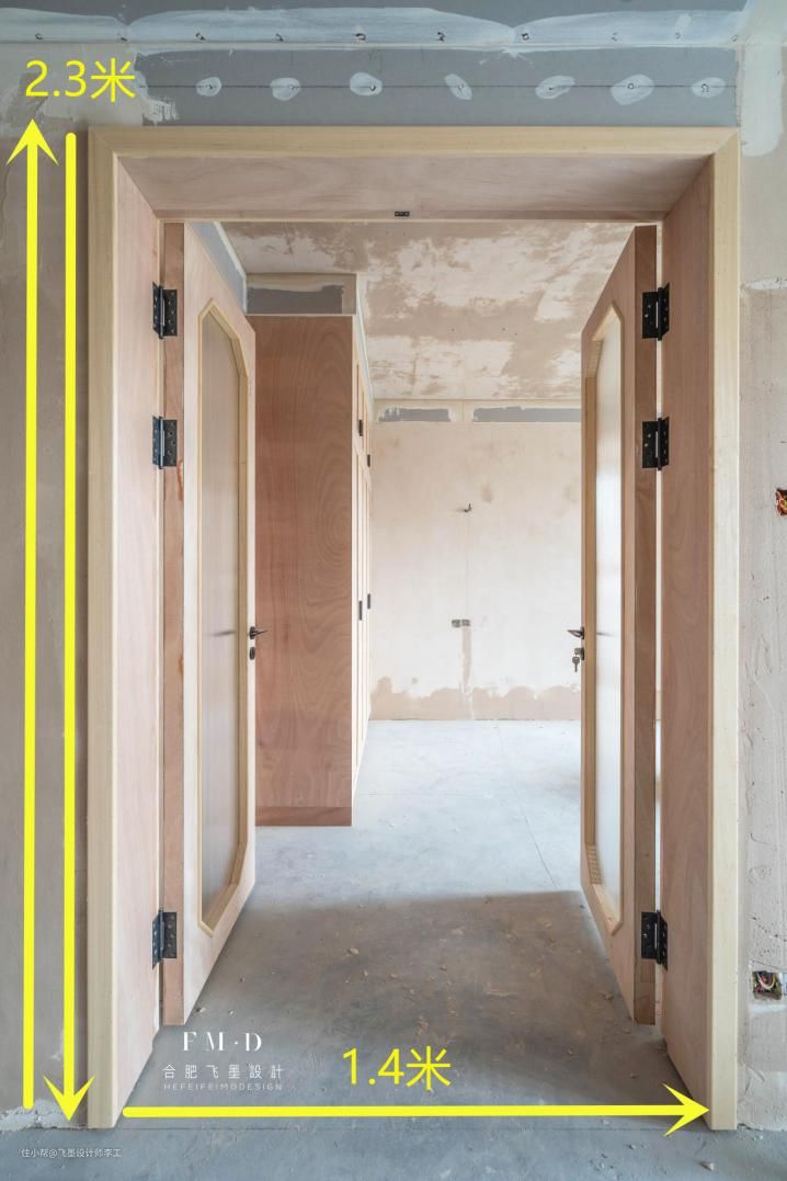 从业主家设计师那里了解到,确定做双门扇的室内门,总得门洞高度为2.3米,双门扇的宽度为1.4米,这样能够保证家人、朋友能够并排进出,互不打扰,后期即使有大件家具要进场的话,也不用担心卡在门中间,将门套或门框给磕碰坏了!