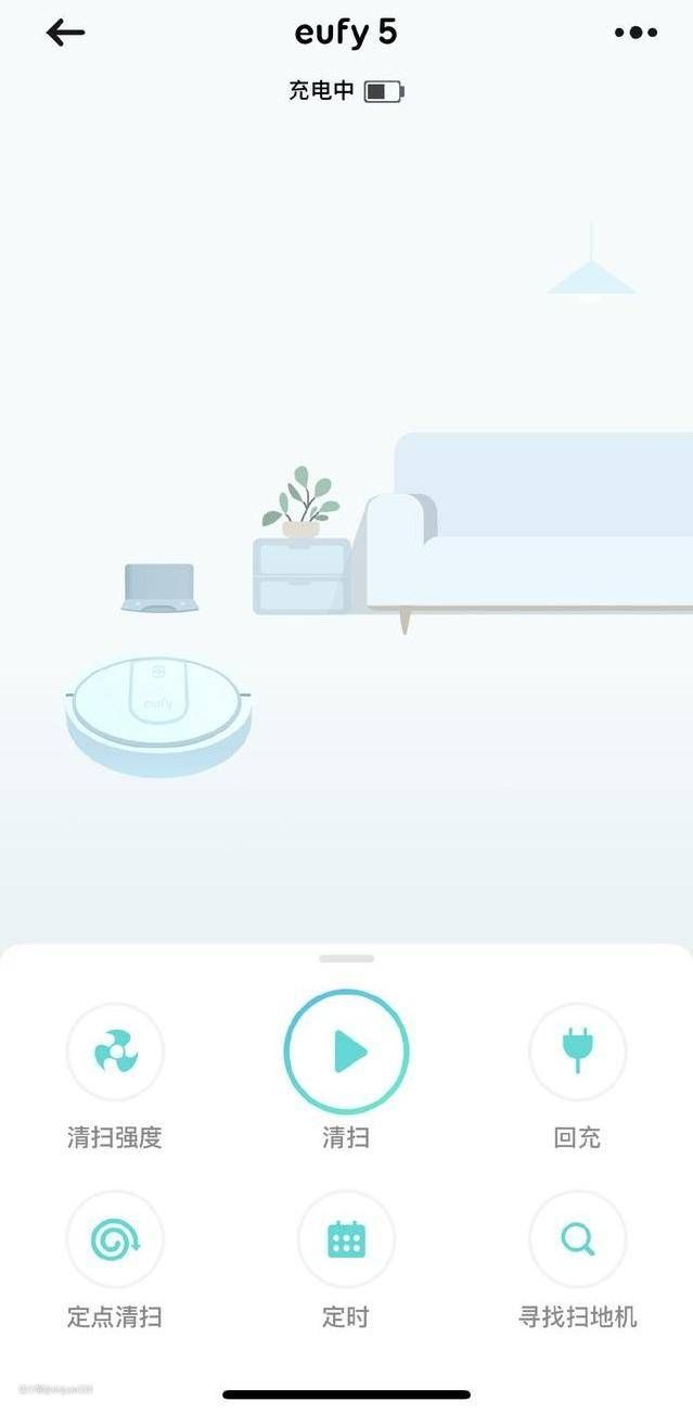 ▼观察一下操作界面,主要是扫清强度、清扫、回充、定点清扫、定时以及寻找扫地机。其实在实际使用中,基本不需要干涉这个智能化的扫拖一体机,除非你需要提前结束清扫或者有别的需求。一般就是定时使用的比较多。