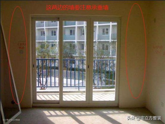 这里宅哥要特别说明,咱们国家大部分的户型在阳台推拉门两边墙上,都会有承重墙的设计,宅哥自己公司去处理阳台这块,也都要现场用电钻钻孔看看有无钢筋,没有才敢打。