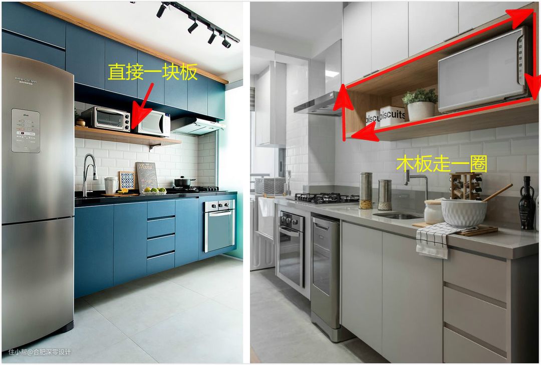 在以上提及的三种解决方案的当中,遇到吊柜装太高这种情况,从预算和操作2方面做考量,我更推荐你们直接在吊柜底部下挂块搁板好。