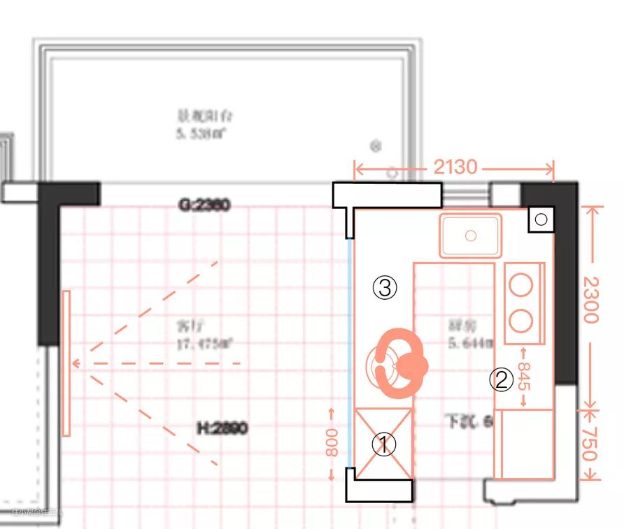 - 由于冰箱不打算挪出去,所以厨房放不下另一个电器高柜了,消毒柜只能装在地柜,可选位置是图中②或③的地柜,只有洗完碗放消毒柜这一步要弯腰