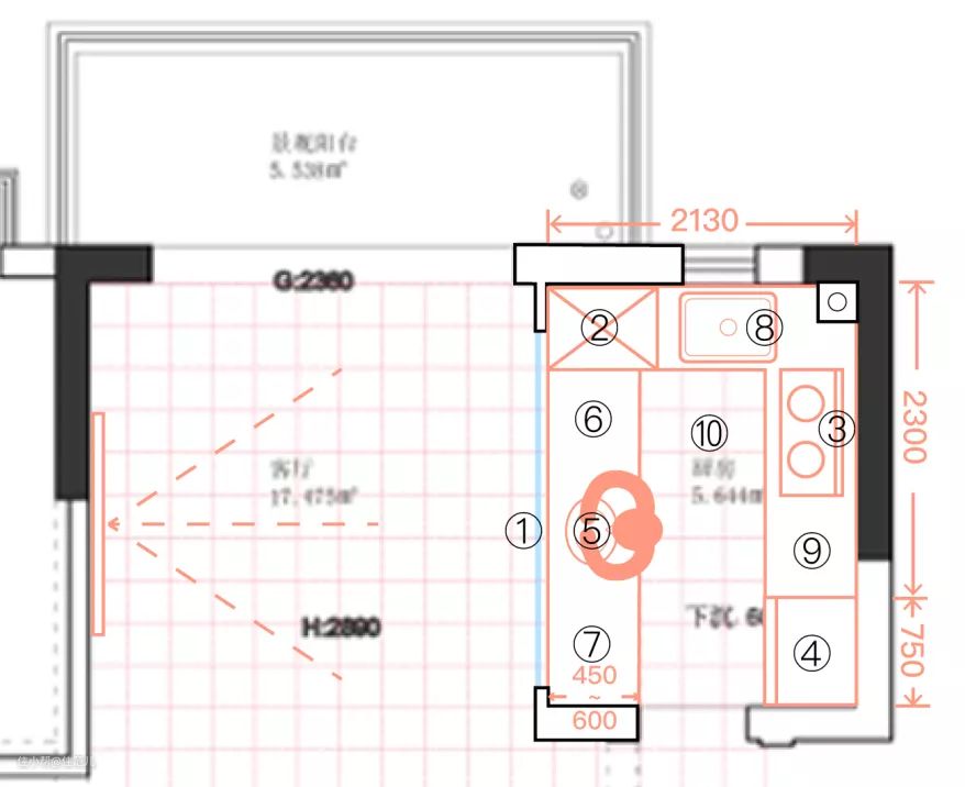 - 为了扩大厨房,厨房计划向客厅推出450mm,为增强厨房社交性,会把这面墙做成半墙半玻璃,墙高1200mm,上为整面玻璃