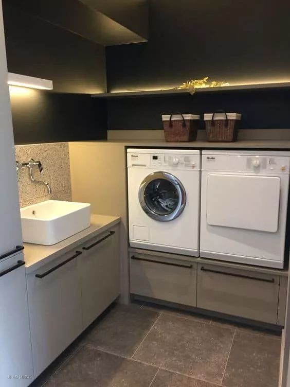 右图虽然装的是洗衣机烘干机,但尺寸和棉花糖家的洗碗机差不多,稍微垫高一点就非常适合老年人,可惜只有大厨房能装。