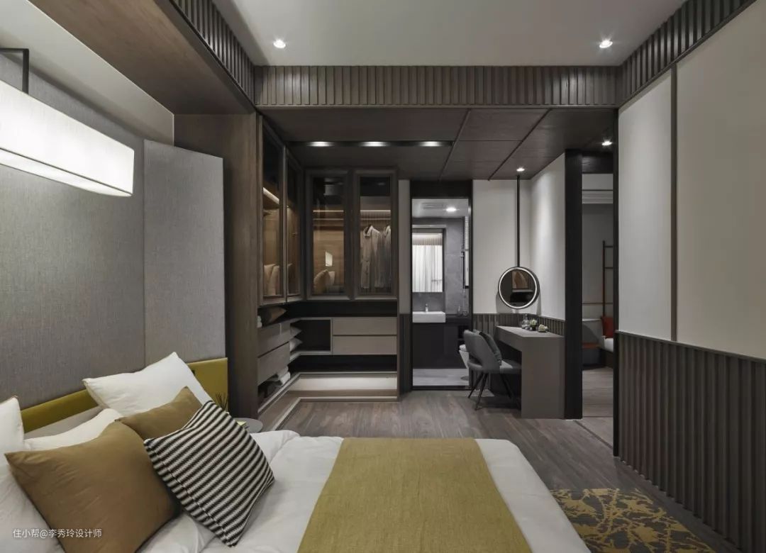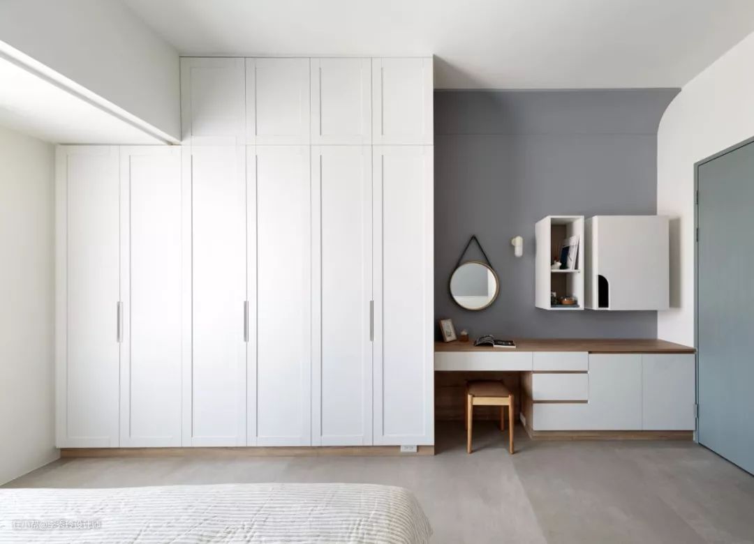 一般美观整洁大方的卧室都用的是定制的或现场手打的打柜子,结合衣柜设计一部分台面延伸出来,既可以当办公桌也可以当梳妆台。这样的梳妆台与衣柜融为一体,既不突兀也不会让整个空间太过单调。